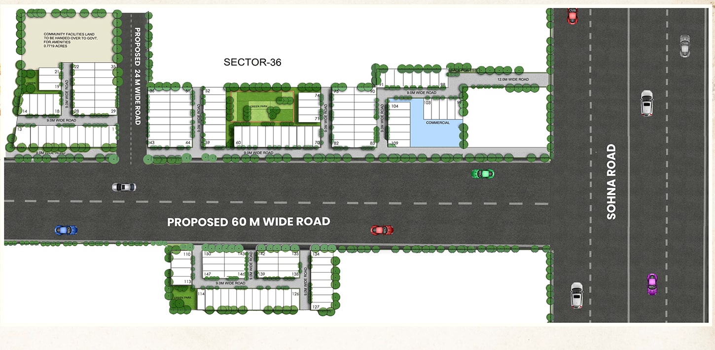 Our project is located in the prime location of Sector 35 & 36 Sohna, which is a rapidly developing area in South of Gurgaon, Sohna. With close proximity to schools, hospitals, shopping centers, and entertainment hubs, our project is perfect for families who want to live in a peaceful environment without compromising on modern amenities.